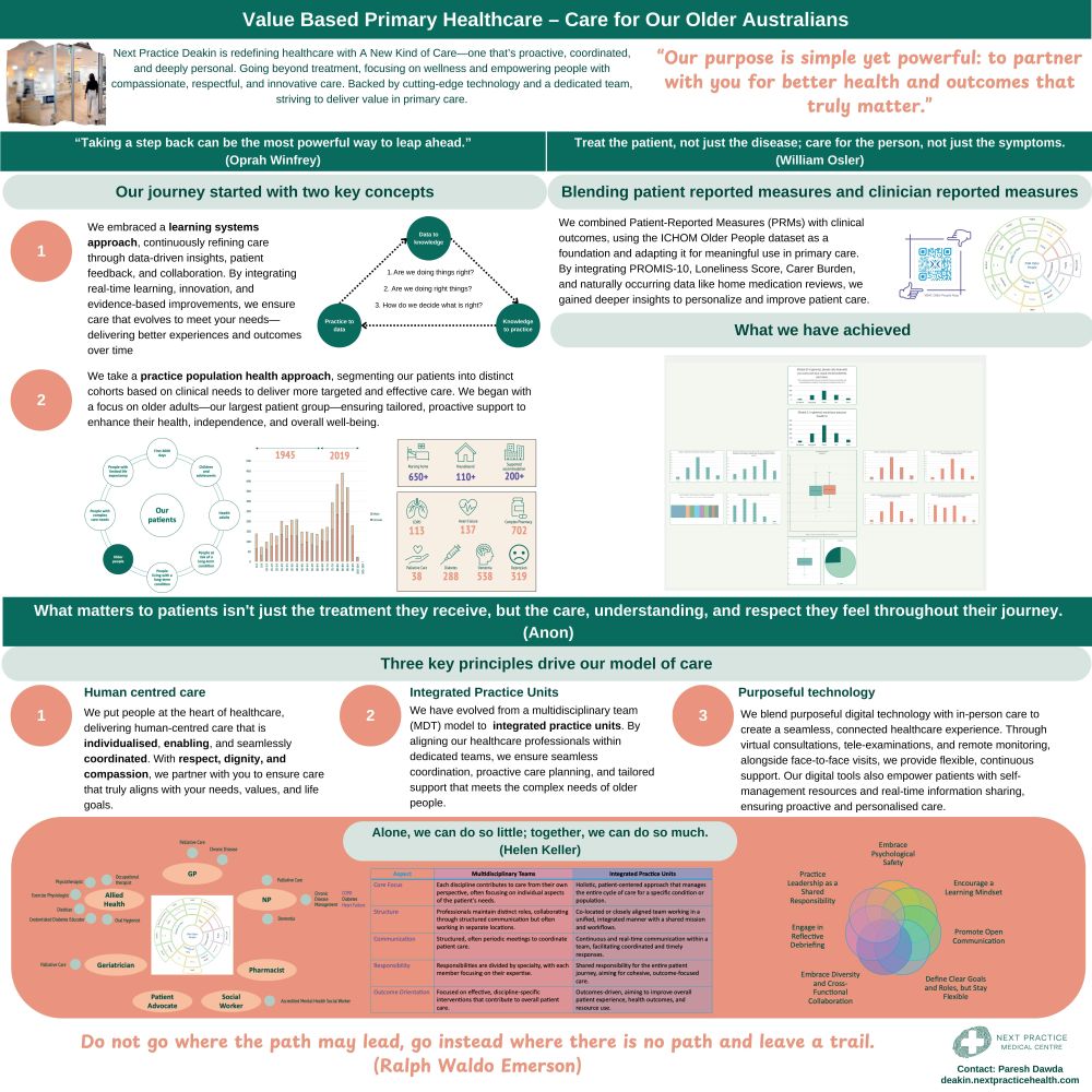 By integrating value-based care into primary care for older adults, this project delivers high-impact, personalised, and future-focused care, ensuring that older people receive the right care, at the right time, in the right place.