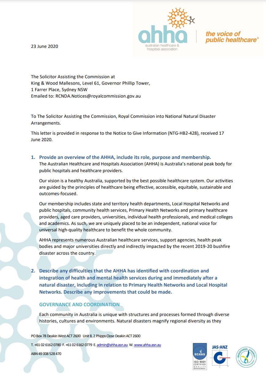 AHHA response – Notice to give information – Royal Commission into National Natural Disaster Arrangements
