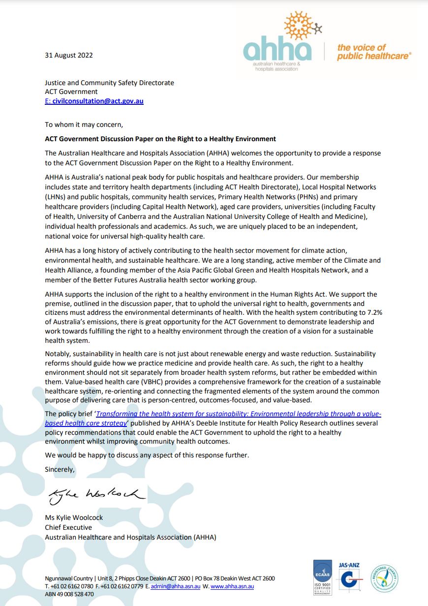 AHHA supports the inclusion of the right to a healthy environment in the Human Rights Act. We support the premise, outlined in the discussion paper, that to uphold the universal right to health, governments and citizens must address the environmental determinants of health. With the health system contributing to 7.2% of Australia’s emissions, there is great opportunity for the ACT Government to demonstrate leadership and work towards fulfilling the right to a healthy environment through the creation of a vision for a sustainable health system.