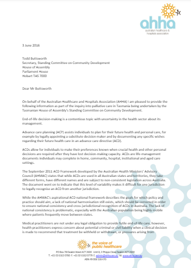 AHHA submission: Inquiry into Palliative Care in Tasmania