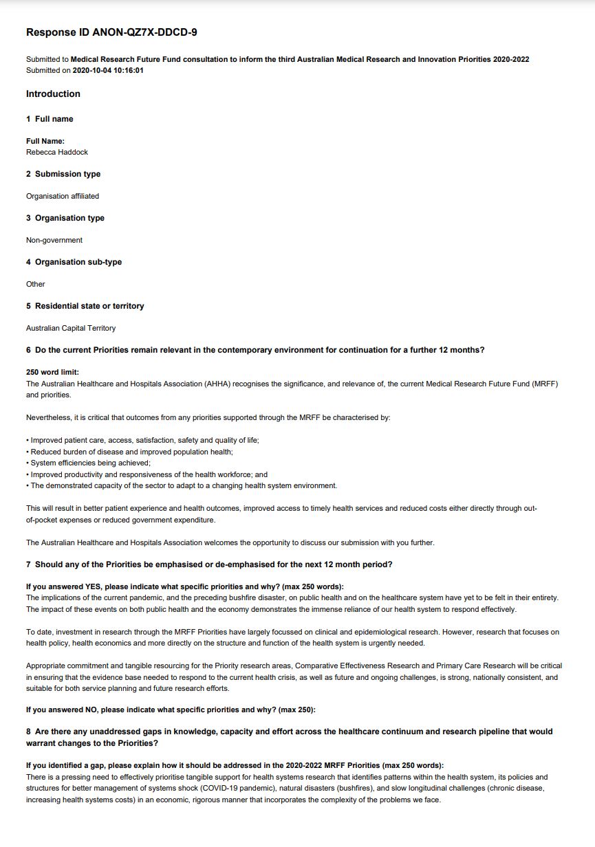 The Australian Healthcare and Hospitals Association (Administrators Appointed) recognises the significance, and relevance of, the current Medical Research Future Fund (MRFF) and priorities. Nevertheless, it is critical that outcomes from any priorities supported through the MRFF be characterised by: