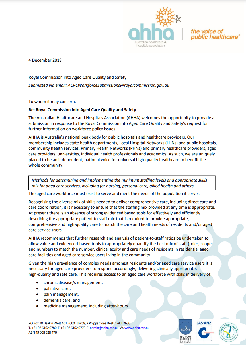 AHHA Submission – Royal Commission into Aged Care – Workforce Issues