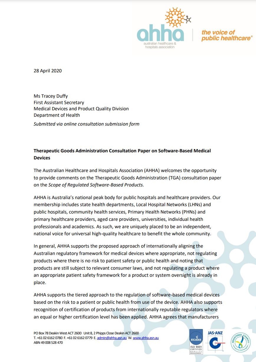In general, AHHA supports the proposed approach of internationally aligning the Australian regulatory framework for medical devices where appropriate, not regulating products where there is no risk to patient safety or public health and noting that products are still subject to relevant consumer laws, and not regulating a product where an appropriate patient safety framework for a product or system oversight is already in place.