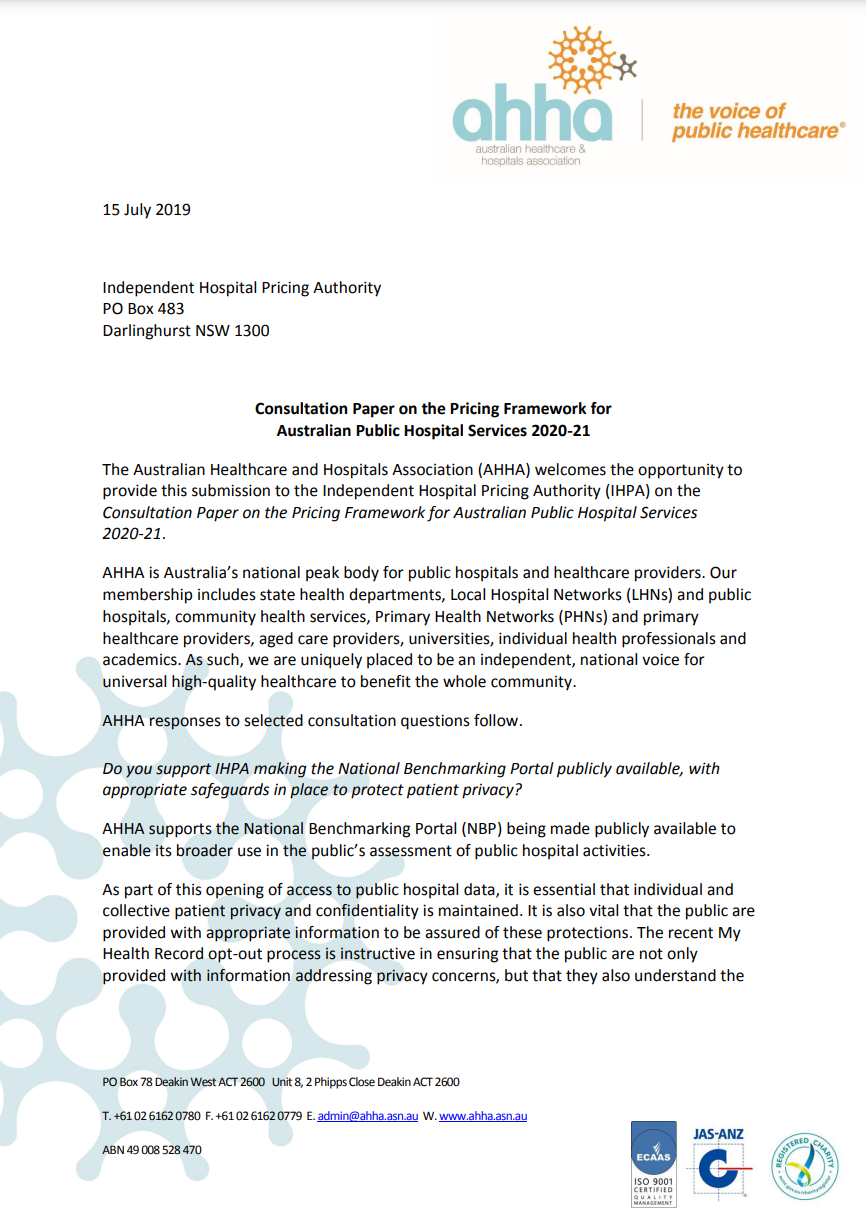 The Australian Healthcare and Hospitals Association (Administrators Appointed) welcomes the opportunity to provide this submission to the Independent Hospital Pricing Authority (IHPA) on the Consultation Paper on the Pricing Framework for Australian Public Hospital Services 2020-21.
