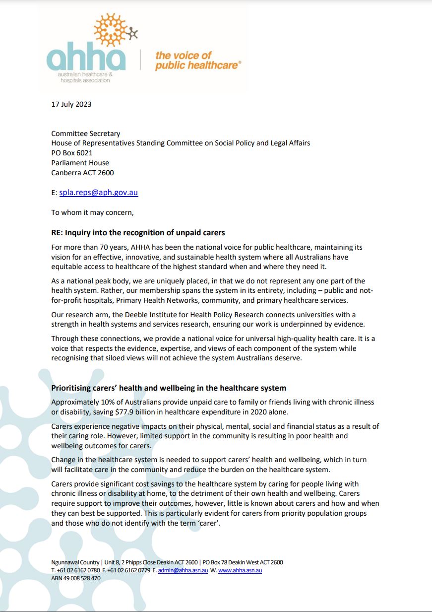 AHHA submission to the Inquiry into the recognition of unpaid carers