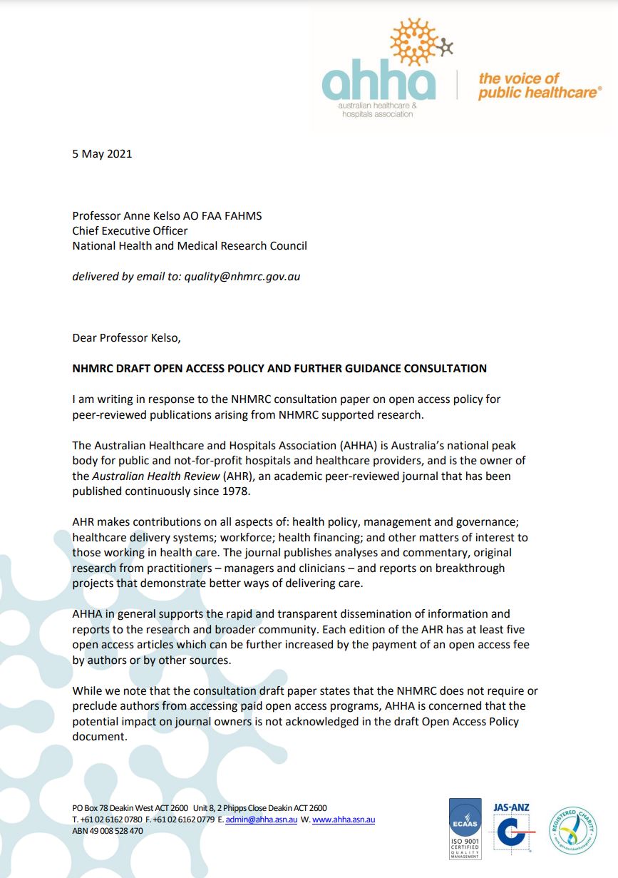 While we note that the consultation draft paper states that the NHMRC does not require or preclude authors from accessing paid open access programs, AHHA is concerned that the potential impact on journal owners is not acknowledged in the draft Open Access Policy document.