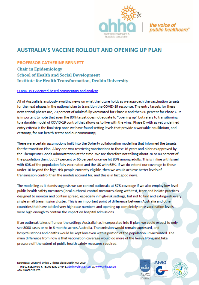 All of Australia is anxiously awaiting news on what the future holds as we approach the vaccination targets for the next phases in the national plan to transition the COVID-19 response. The entry targets for these next critical phases are, 70 percent of adults fully vaccinated for Phase B and then 80 percent for Phase C. It is important to note that even the 80% target does not equate to “opening up” but refers to transitioning to a durable model of COVID-19 control that allows us to live with the virus. Phase D with as yet undefined entry criteria is the final step once we have found setting levels that provide a workable equilibrium, and certainty, for our health sector and our community.