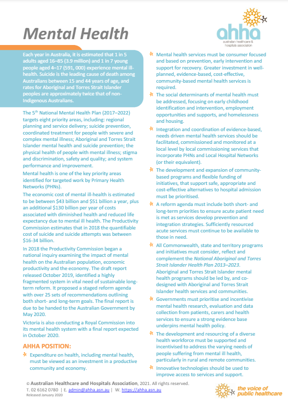 The 5th National Mental Health Plan (2017–2022) targets eight priority areas, including: regional planning and service delivery; suicide prevention, coordinated treatment for people with severe and complex mental illness; Aboriginal and Torres Strait Islander mental health and suicide prevention; the physical health of people with mental illness; stigma and discrimination, safety and quality; and system performance and improvement.