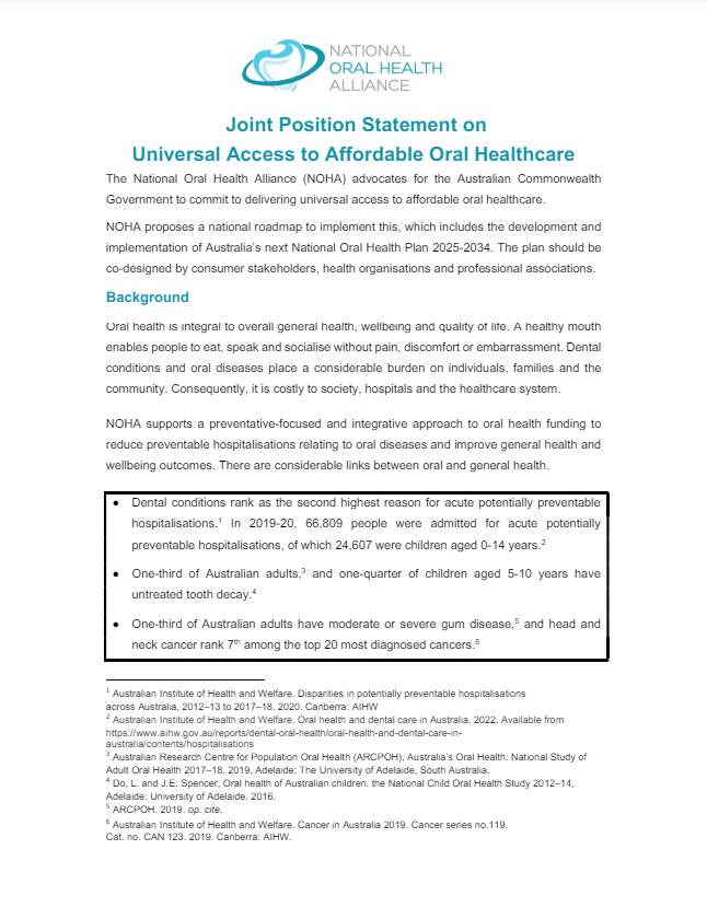 NOHA proposes a national roadmap to implement this, which includes the development and implementation of Australia’s next National Oral Health Plan 2025-2034. The plan should be co-designed by consumer stakeholders, health organisations and professional associations.