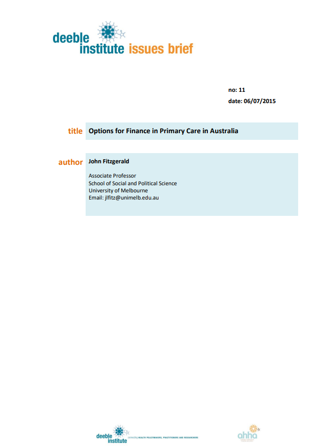 Several policy initiatives aimed at reform of primary health care financing are currently either being debated nationally or trialled in different jurisdictions. Authored by University of Melbourne Associate Professor John Fitzgerald, this issues brief identifies ways to consider primary health care finance policy with a focus on health outcomes. The brief proposes a mechanism for including impact investing into primary care financing.