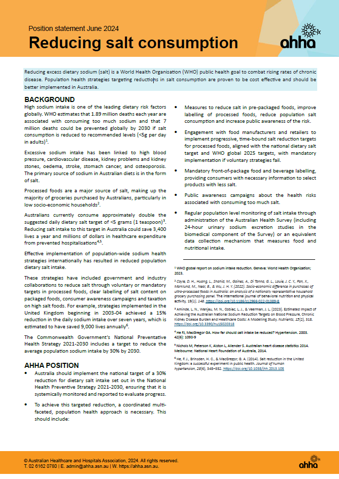 Reducing excess dietary sodium (salt) is a World Health Organisation (WHO) public health goal to combat rising rates of chronic disease. Population health strategies targeting reductions in salt consumption are proven to be cost effective and should be better implemented in Australia.