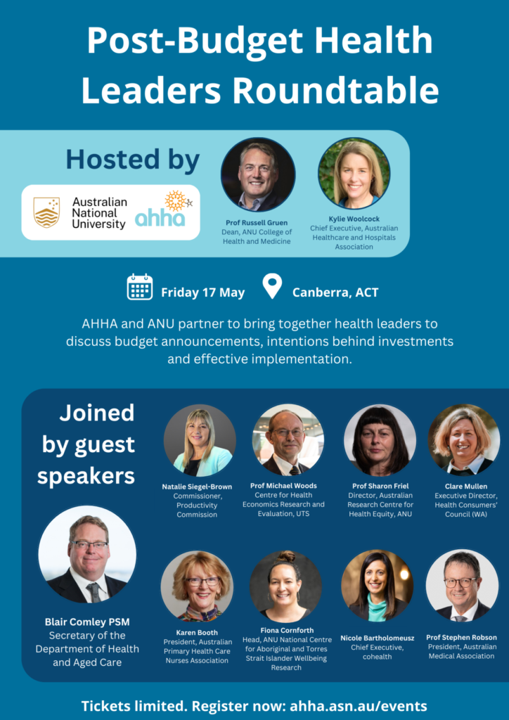 Following the release of the 2024-25 Federal Budget on Tuesday 14 May, AHHA and ANU are partnering to host the Post-Budget Health Leaders Roundtable event.