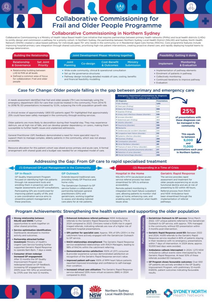 Authors: James Inglis, Chrystjan Bowers, Justine Barnard Collaborative Commissioning is a Ministry of Health Value Based Health Care initiative that partners primary health networks and local health districts to jointly design and commission care pathways for priority groups. In Northern Sydney, Northern Sydney Local Health District (NSLHD) and Sydney North Health Network (SNHN) partnered to create a value-based pathway for […]