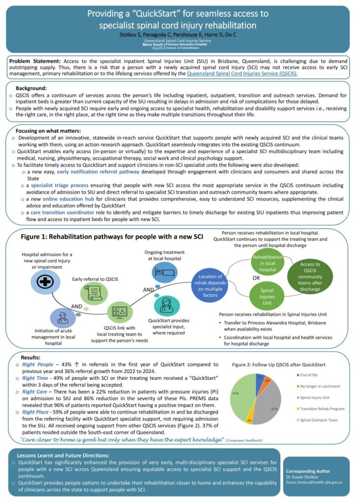 Authors: Susan Stoikov, Kirsten Sue See, Claire Panagoda, Kiley Pershouse, Donna Harre, Chau Do The Queensland Spinal Cord Injuries Service (QSCIS) is experiencing increased need for its Statewide specialist inpatient Spinal Injuries Unit (SIU) in Brisbane, impacting timely access to specialist support for people with new spinal cord injuries (SCI). Limited specialist inpatient beds, combined with Queensland’s vast geographical area, can lead to delays in accessing […]