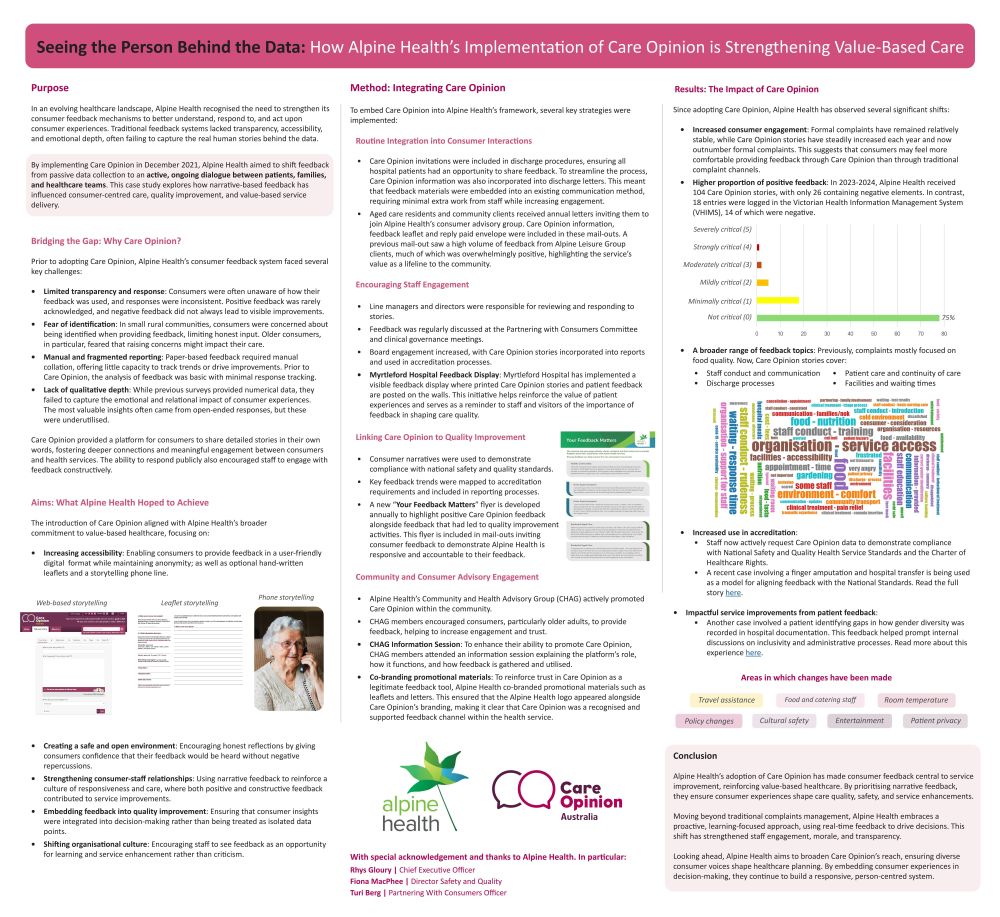 Authors: Ellen McGovern-Greco, Sarah Higgins, Turi Berg, Fiona MacPhee Traditional feedback systems lacked transparency, accessibility, and emotional depth, often failing to capture the real human stories behind the data. Before adopting Care Opinion, Alpine Health’s patient feedback system faced key challenges, including limited transparency and response, fear of identification in small rural communities, manual and fragmented reporting, and a lack of qualitative […]