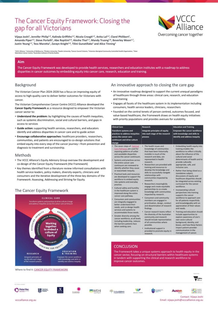 Authors: Vijaya Joshi Australia has made great progress in cancer care through early detection, public health initiatives, and better access to high-quality treatment. Despite having some of the best cancer outcomes worldwide, inequalities still exist in Victoria’s cancer sector. A lack of quality data on priority populations makes it difficult to fully understand and address […]