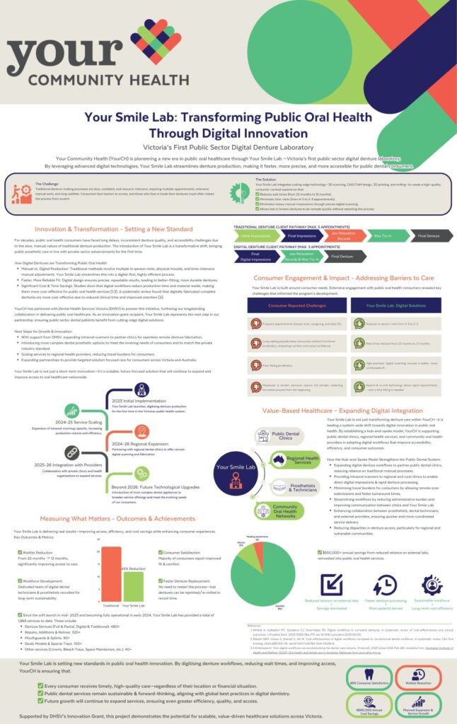 Authors: Emily Grace, Catherine Grindlay Your Smile Lab is a groundbreaking initiative that has transformed denture production in Victoria’s public dental system. As the first public sector digital denture laboratory, it removes long-standing barriers to access, ensuring that public patients receive high-quality, well-fitting dentures faster than ever before. Previously, public dental patients faced wait times of 22 months […]
