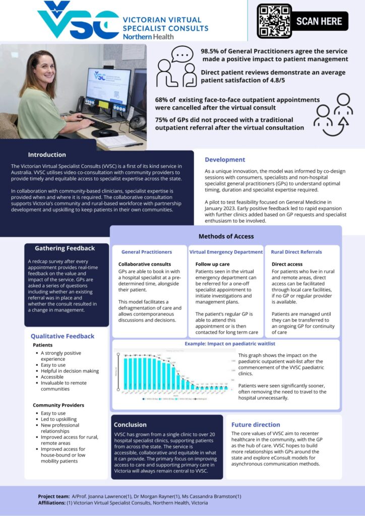 Authors: Joanna Lawrence, Morgan Raynor, Cassandra Bramston The Victorian Virtual Specialist Consults (VVSC) is a first of its kind service in Australia utilising video co-consultation with community providers to provide timely and equitable access to specialist expertise across the state. In short, VVSC provides specialist care differently. In collaboration with community-based clinicians, specialist expertise is provided when and where […]